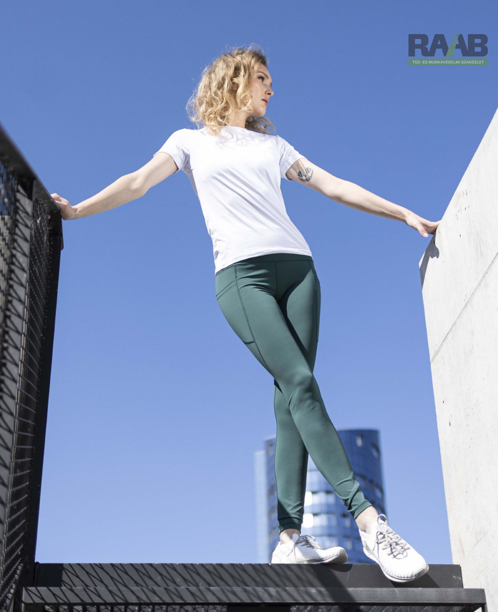 Női sportleggings megemelt, megerősített derékrésszel, kifejezetten nők számára fejlesztve.