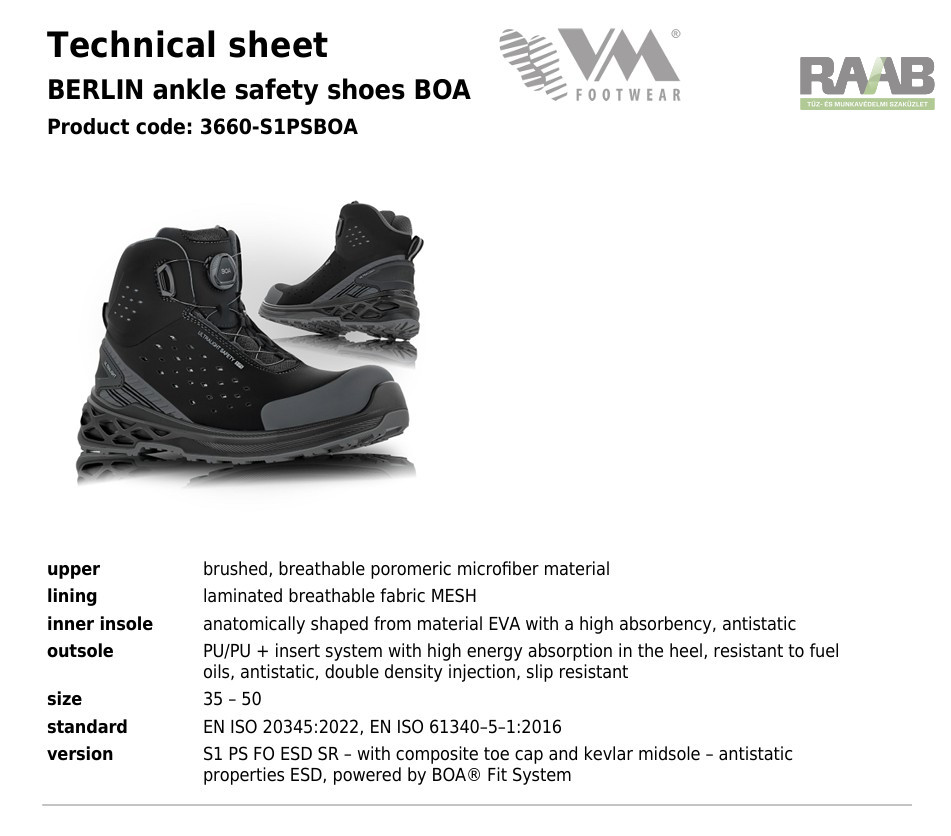 Modern kivitelű, kivállóan szellőző, kopásálló szálcsiszolt felsőrésszel készülő VM munkavédelmi bakancs,