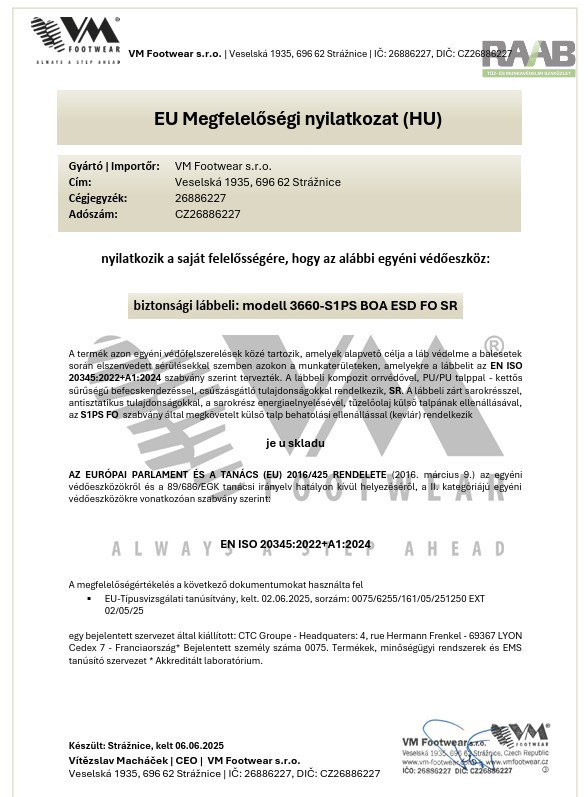 Standard: EN ISO 20345:2023, EN ISO 61340–5–1:2017 szerk. 3