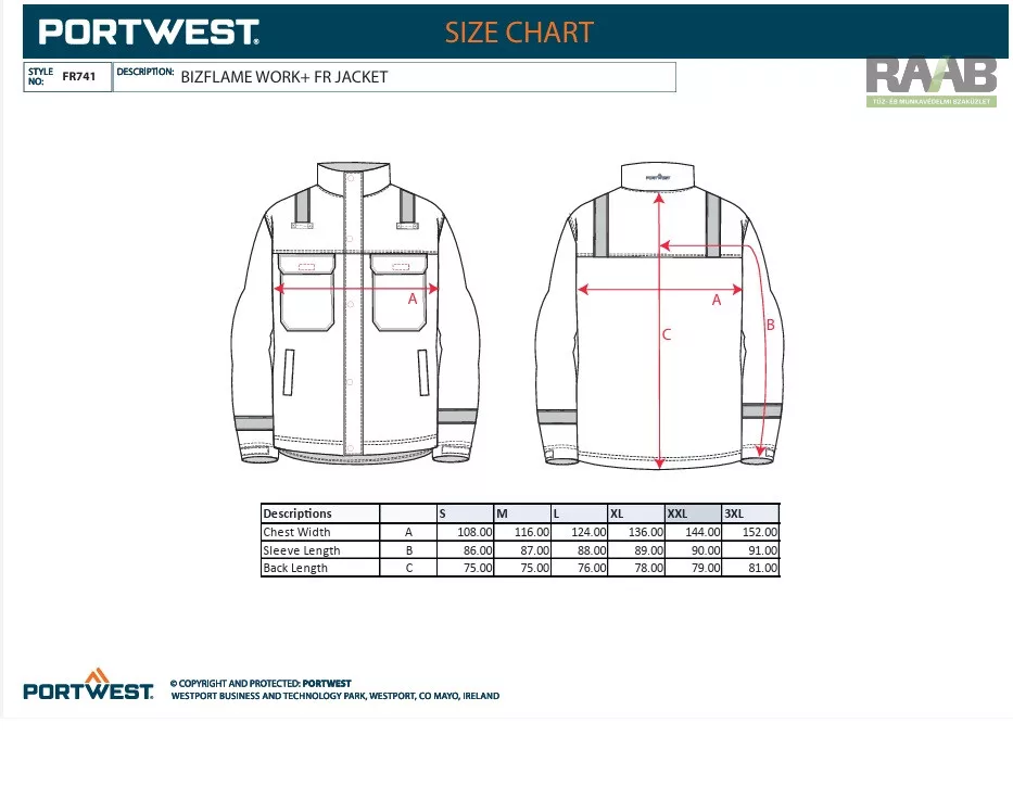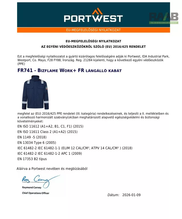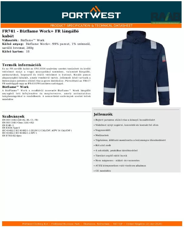 Ez az FR saválló kabát az EN13034 szabvány szerint tanúsított