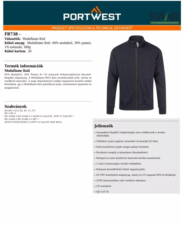 Külső alapanyag : Modaflame Kötött anyag: 60% modakril, 39% pamut, 1% szénszál 300g