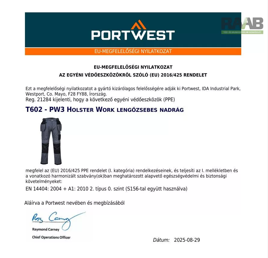 EN 14404: 2004 + A1: 2010 2. típus 0. szint (S156-tal együtt használva)