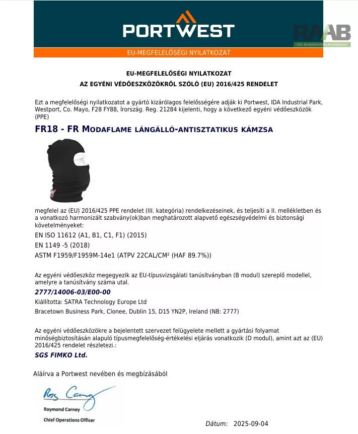 EN ISO 11612 A1, B1, C1, F1