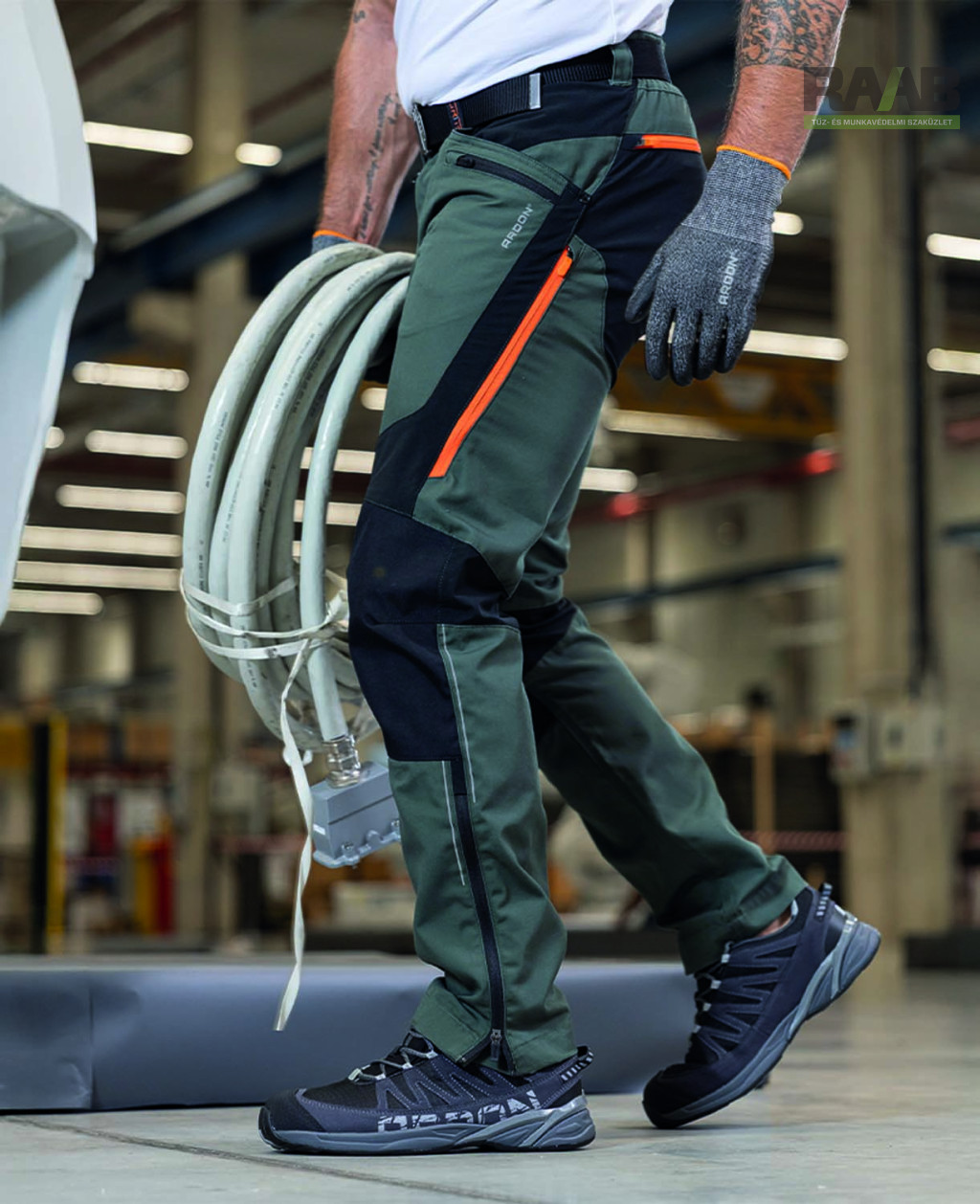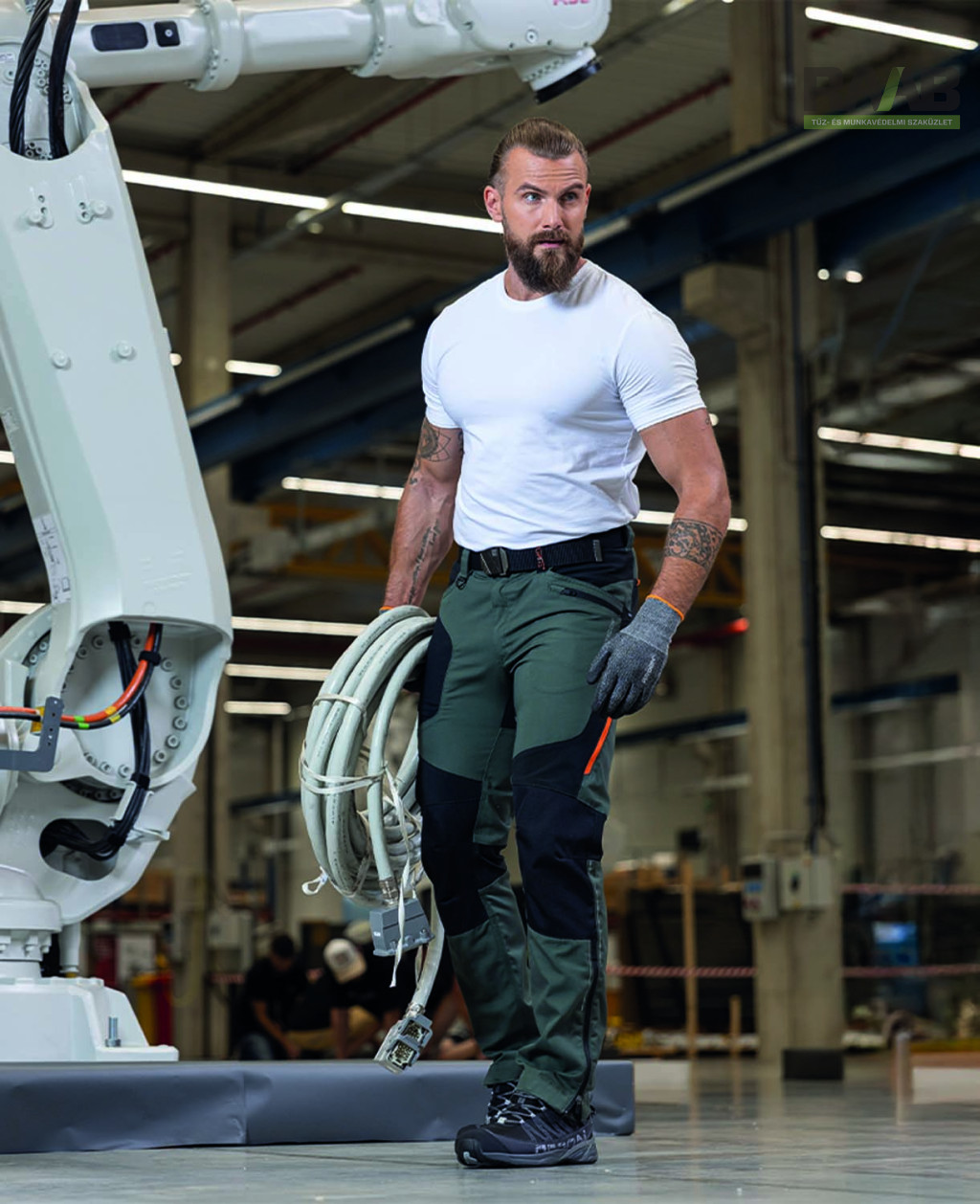 A deréknál viselhető, sztreccs betétekkel ellátott munkanadrág a maximális kényelemre és hosszú élettartamra lett tervezve.