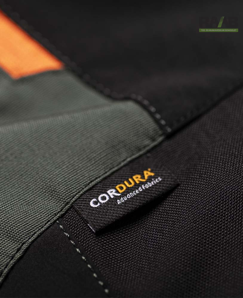 A nadrág speciális szövetből készült, megerősített Cordura® panelekkel a nagy igénybevételnek kitett részek maximális kopás elleni védelme érdekében.