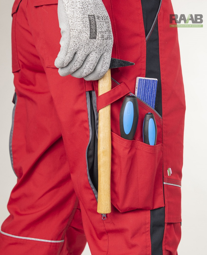 Dupla anyag térdrészen, térdzseb jól láthatósági csíkok elöl és hátul.