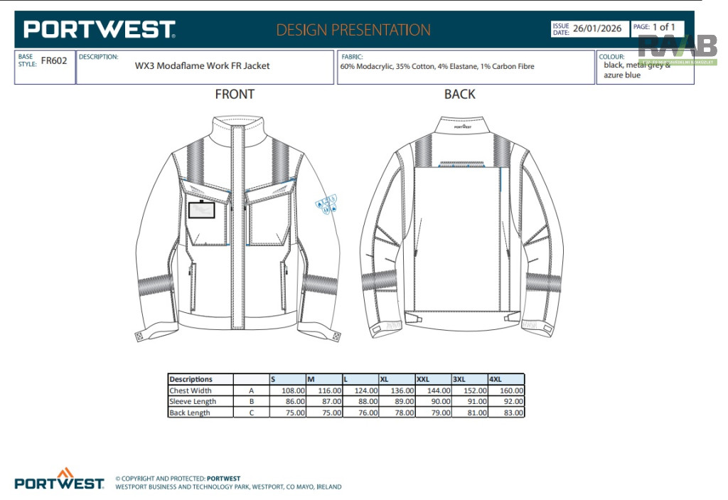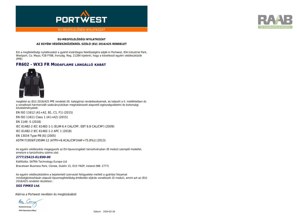 Korszerű lángálló kabát, amely a saját Modaflame 280gm anyagunkból készült.