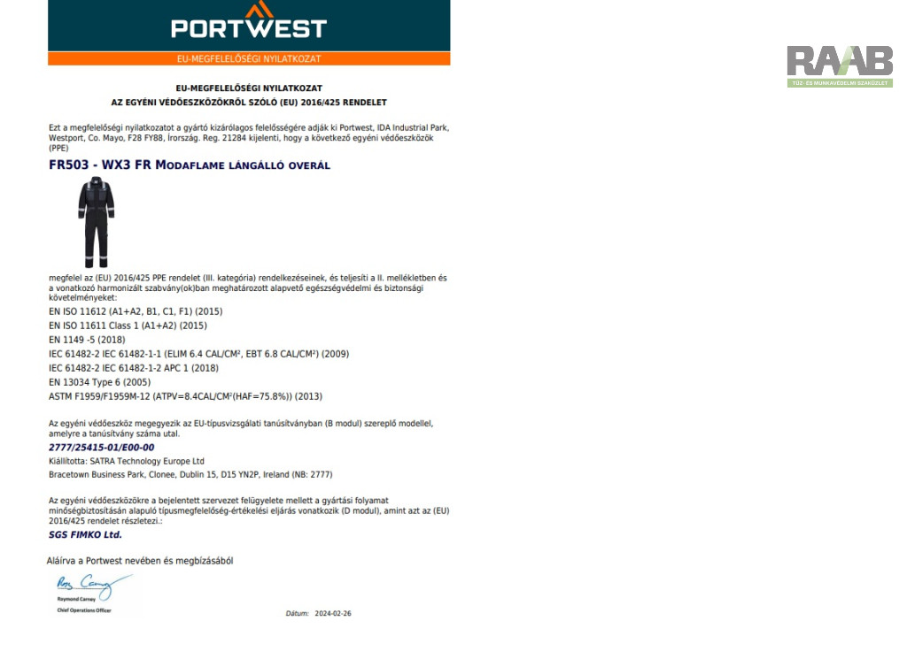EN ISO 11612 A1+A2, B1,C1,F1